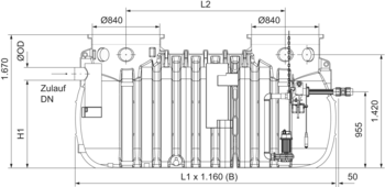 - Grease separator according to EN 1825-1 made of polyethylene for underground installation with integrated dual pumping station according to EN 12050